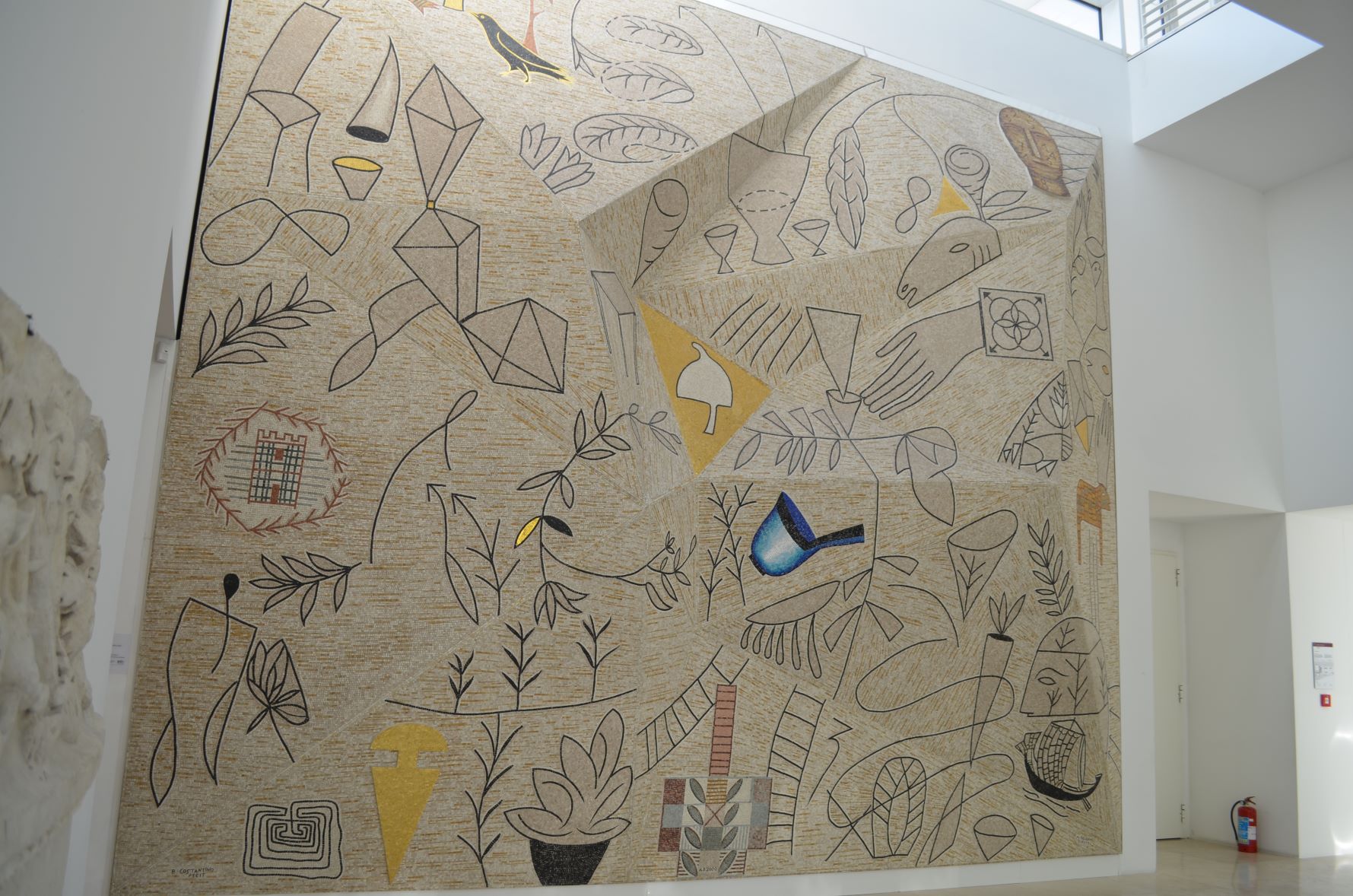 壁画は大きな三角形と四角形で面取りをされた凹凸の大きいレリーフになっている。かなり珍しい形状だ。部屋には光があふれている。光の変化でモザイクの表情もずいぶん変化するだろう。面取りのシャープなエッジは光によって強調され、現代的な印象を与える。